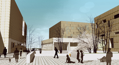 Yinzhou Cultural Activity Center for Ningbo, Zhejiang Province, China Led by Professor Peter Tagiuri and Mr. Hao Ru Chen, London design firm Association of Ideas and Hangzhou, China-based firm Citiarc won an invited competition for a 30,000 sq.m. public activity center in Ningbo, China. Planned on the site of an existing village, the center will include educational, commercial, sports, administration, and performance spaces, as well as public gardens and riverfront plazas. Major elements of the design strategy include a sustainability emphasis, scaling up the traditional Chinese courtyard for civic use, reusing local materials, and referencing the pre-existing village. Team members included Patrick Beins, Allison Coley, Cai Jun, and Huang Ze. Other invited competitors included Studio Pei Zhu from Beijing, Professor Bernhard Winking from Hamburg, Architect Tang Hua from ShenZhen, and ZhongJian Guoji Office from Beijing. Construction is anticipated to begin in late 2007. |
